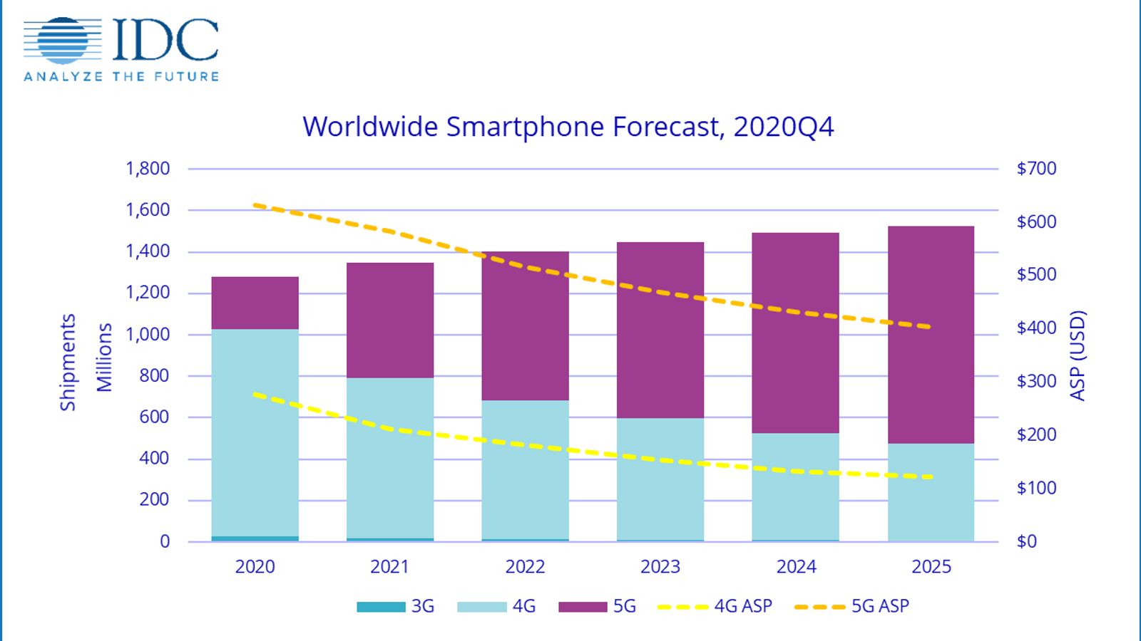Другими словами, 5G отводится роль движущего фактора. Аналитики полагают, что на смартфоны 5G в 2021 году придется более 40% всех поставок, а к 2025 году этот показатель увеличится до 69%. Растущая конкуренция приведёт к тому, что средняя отпускная цена аппаратов с поддержкой сетей пятого поколения к концу периода, охваченного прогнозом, то есть к 2025 году, упадёт до 404 долларов.