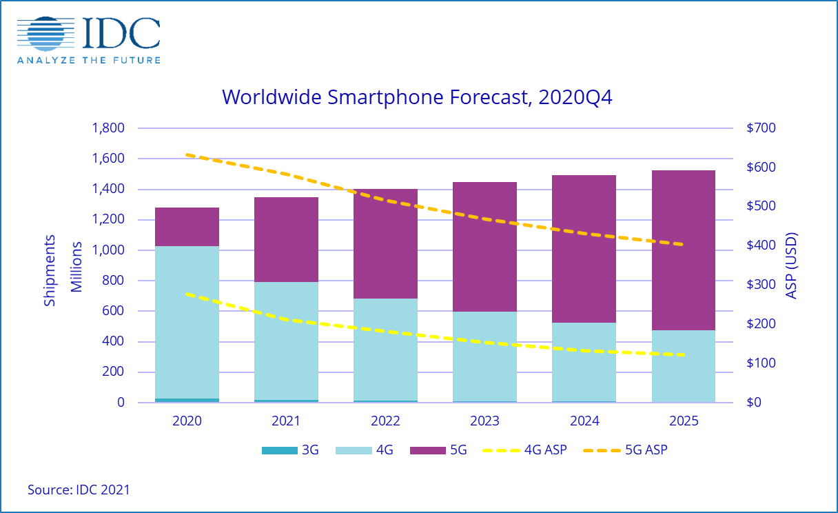 Другими словами, 5G отводится роль движущего фактора. Аналитики полагают, что на смартфоны 5G в 2021 году придется более 40% всех поставок, а к 2025 году этот показатель увеличится до 69%. Растущая конкуренция приведёт к тому, что средняя отпускная цена аппаратов с поддержкой сетей пятого поколения к концу периода, охваченного прогнозом, то есть к 2025 году, упадёт до 404 долларов.