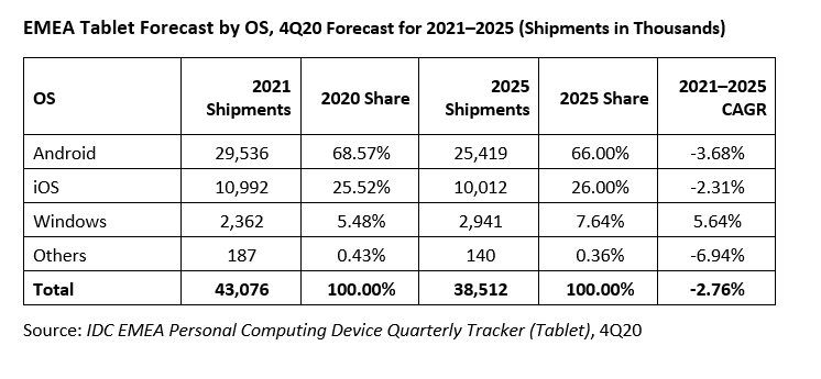 Несмотря на сильную динамику в первом квартале, рынок планшетов в регионе EMEA, по прогнозам, за 2021 год в целом сократится на 10,5%. Это связано с тем, что спрос, спровоцированный пандемией, будет почти полностью удовлетворен. В период с 2021 по 2025 год продажи планшетов в рассматриваемом регионе будут сокращаться в среднем на 2,76% в год.