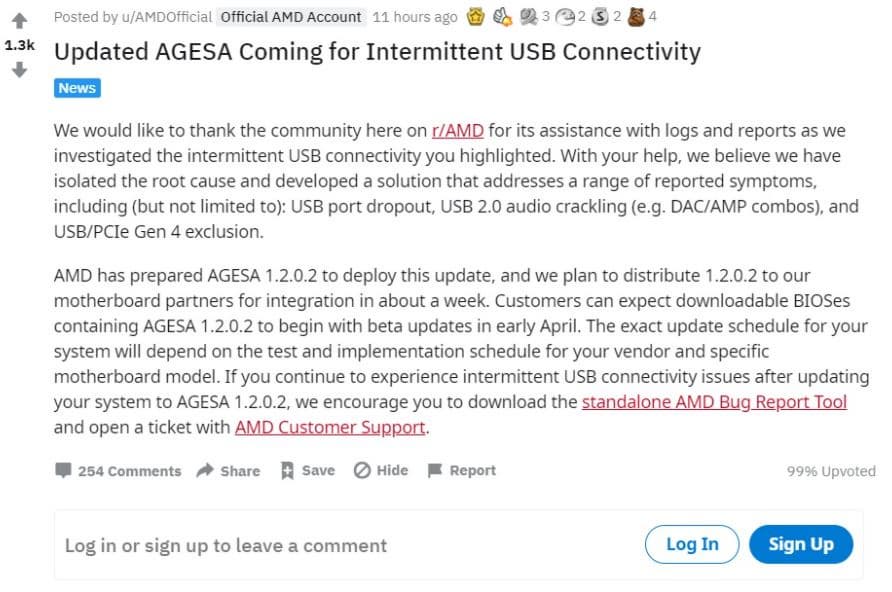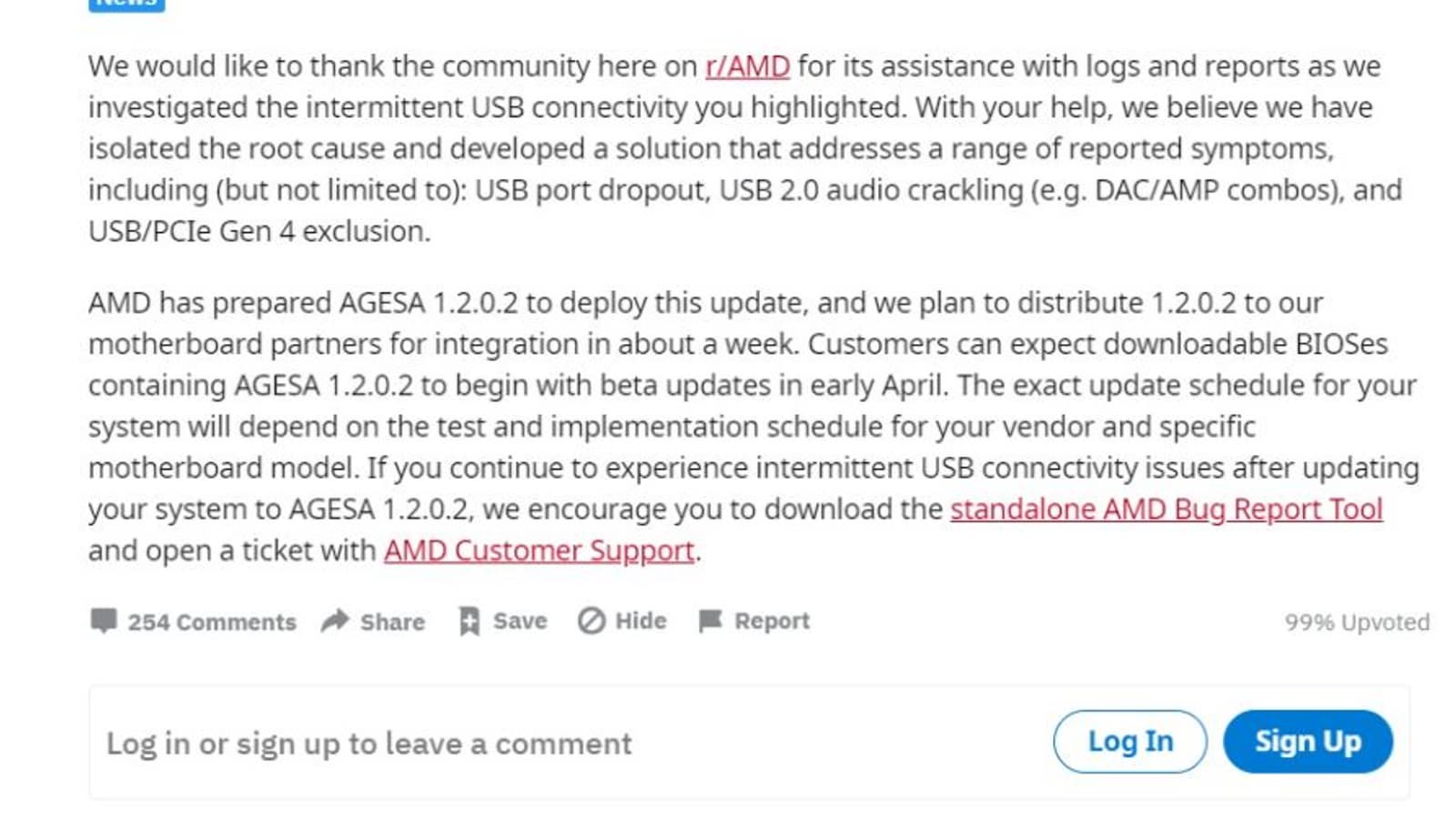 Судя по сообщению AMD на крупнейшем американском форуме Reddit, проблема «отваливающихся» портов USB локализована и решена в новой версии микрокода AGESA — версии 1.2.0.2. Через неделю AMD обещает направить его производителям материнских плат, а бета-версии BIOS для пользовательских устройств на базе AGESA 1.2.0.2 ожидаются в начале апреля. Компания поблагодарила всех пользователей, помогавших разобраться с проблемой.