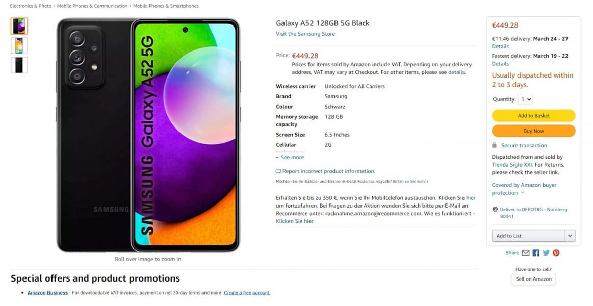Однако в польском магазине Galaxy A52 5G можно будет заказать по цене от 415 евро за версию 6/128 ГБ. В немецком Amazon смартфон предлагается по цене от 450 евро.