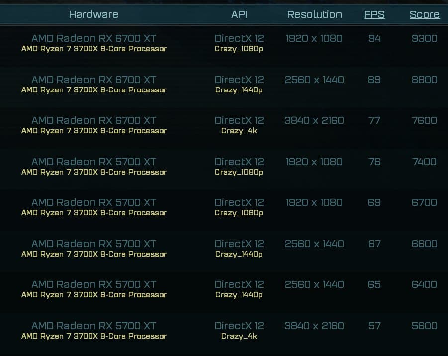 Так как этот бенчмарк достаточно своеобразный, наиболее разумно сравнивать новинку с предшественницей. В итоге RX 6700 XT обходит RX 5700 XT на 26-33% в зависимости от режима.