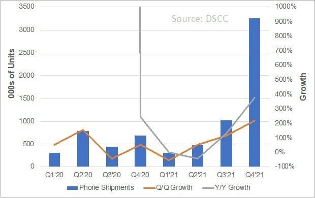 В четвертом квартале 2020 года поставки складных смартфонов выросли на 54% в квартальном выражении и на 242% — в годовом. Однако ожидается, что в первом квартале текущего года поставки вырастут всего на 1% в годовом выражении, а во втором квартале — и вовсе сократятся на 40% из-за отсутствия новых моделей. Однако в третьем квартале рост превысит 100%. Такой же прогноз аналитики дают в отношении четвертого квартала.