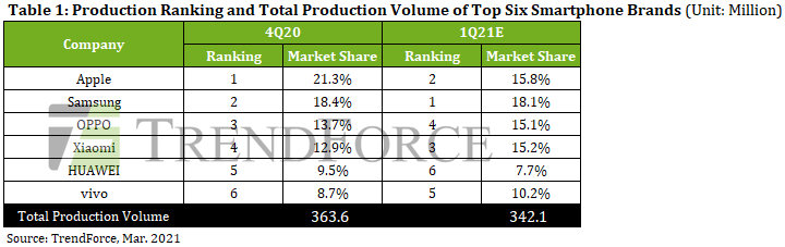 Вследствие хороших продаж смартфонов Apple iPhone 12 серии, а также агрессивной стратегии китайских производителей в ответ на санкции США против компании Huawei, которая в результате потеряла значительную долю рынка, мировое производство смартфонов в этом квартале сократится всего на 6% по сравнению с предыдущим кварталом. Всего в период с января по март будет отгружено 342 млн устройств. Такие данные содержатся в прогнозе, опубликованном на этой неделе аналитической компанией TrendForce. Аналитики добавляют, что указанное значение соответствует росту в годовом выражении на 25%.