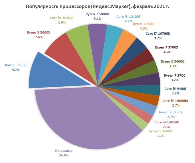 Если же говорить о частностях, то самым популярным процессором у российских пользователей по данным Яндекс.Маркет является шестиядерный Ryzen 5 3600. На него одного приходится 9,7% рынка. Он лидирует уже четыре месяца подряд.
