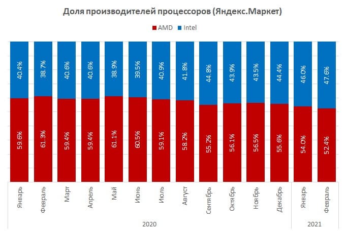 Яндекс.Маркет опубликовал статистику по рынку процессоров в России за текущий год. Если в Европе и США AMD активно теснит Intel (хотя в последнее время, ввиду дефицита процессоров «красных», теснит уже не так активно), то у нас ситуация обратная: Intel отвоёвывает долю. Так, если в феврале прошлого года доля Intel составляла лишь 38,7%, то сейчас уже — 47,6%. Это очень приличный рост. В свою очередь, доля AMD снизилась с 61,3% до 52,4%. Только за январь текущего года доля AMD упала на 1,6%!