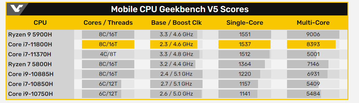 Если сравнивать результаты Core i7-11800H с другими процессорами, то можно видеть, что новинка Intel опережает Ryzen 7 5800H, но уступает Ryzen 9 5900H. При этом отрыв от предшественников очень велик.