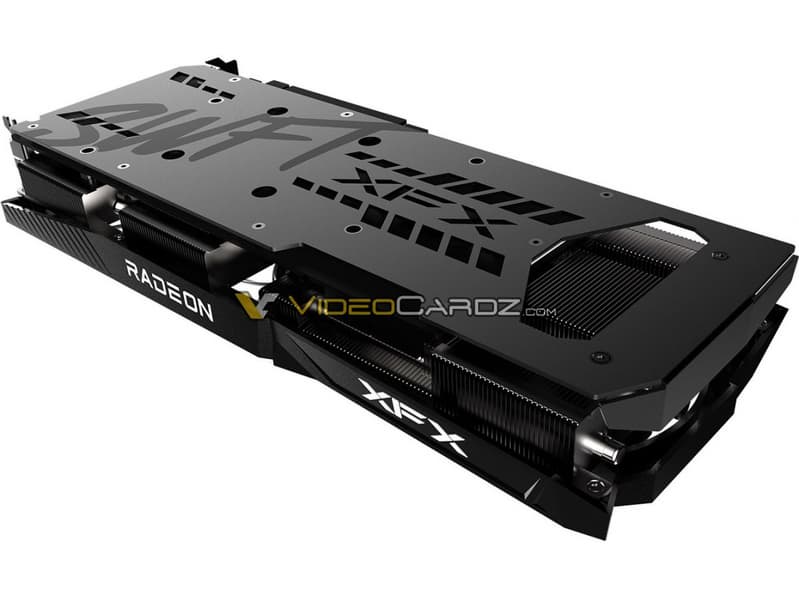 От QICK319 и MERC319 третья модель отличается довольно сильно, во всяком случае, внешне. Хотя конструкция её системы охлаждения тоже включает три вентилятора, кожух делает её больше похожей на кожух системы охлаждения видеокарты Zotac GeForce RTX 3080 AMP Edition. Карта окрашена в чёрный цвет, на котором контрастно выделены белым логотипы XFX и Radeon. На задней панели, полностью закрывающей печатную плату, также есть большой логотип SWFT.