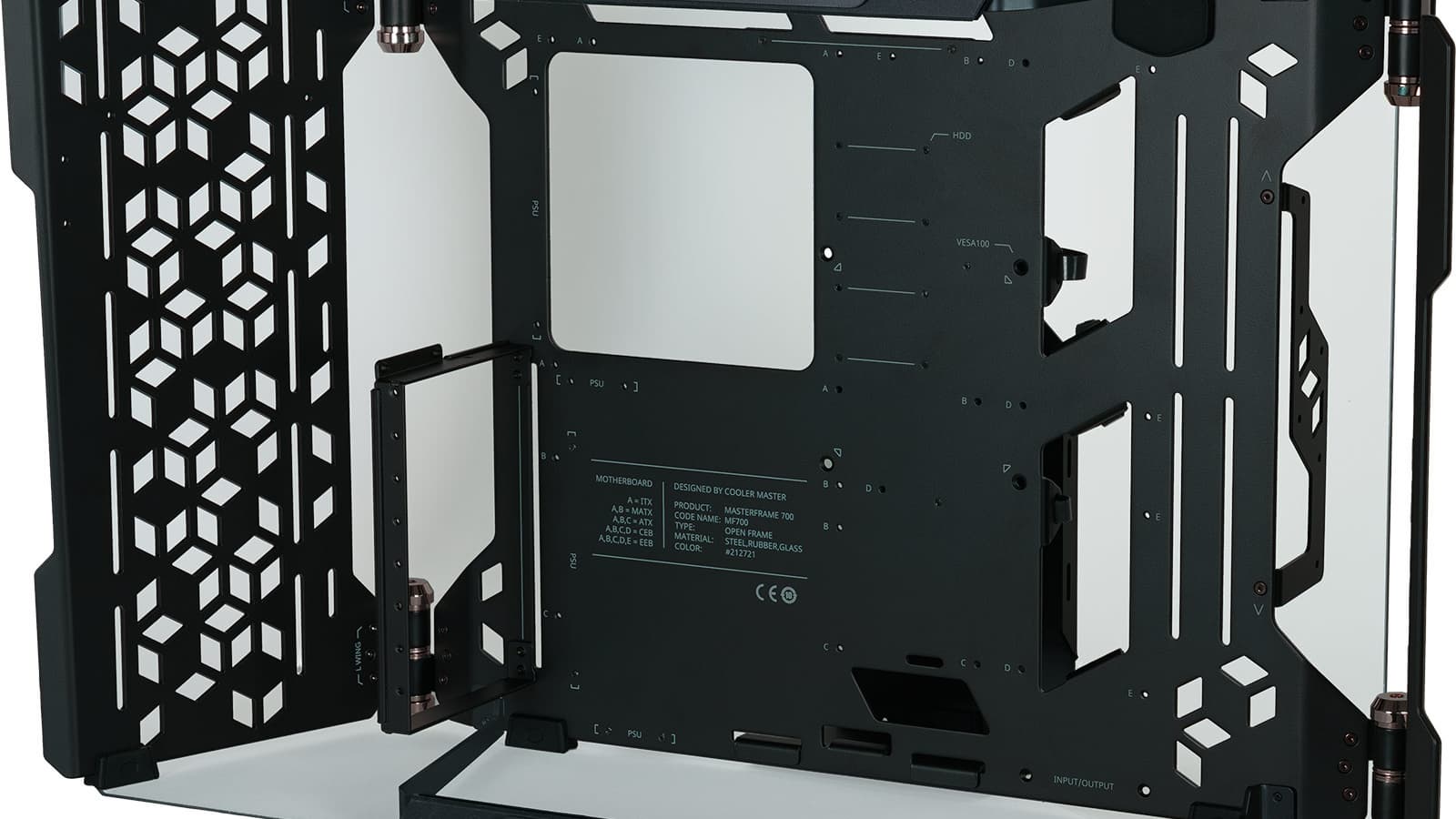 Конструкция MasterFrame 700 включает три части. В центре расположен лоток для системной платы, к которому по бокам прикреплены «крылья». Крепление с помощью специально разработанных фрикционных шарниров позволяет придать необходимую конфигурацию и надежно зафиксировать её. Именно крылья превращают открытый корпус, в котором плата ориентирована вертикально, в стенд в форме столика с горизонтальным расположением лотка для платы. В первом случае компоненты прикрыты панелью из закалённого стекла.