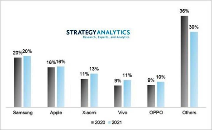 По прогнозу Strategy Analytics, за год будет отгружено 1,38 млрд устройств. Это на 6,5% больше, чем в 2020 году. Надежды на рост аналитики связывают в основном с улучшением экономической ситуации по мере ослабления пандемии COVID-19 и перехода на модели с поддержкой 5G.
