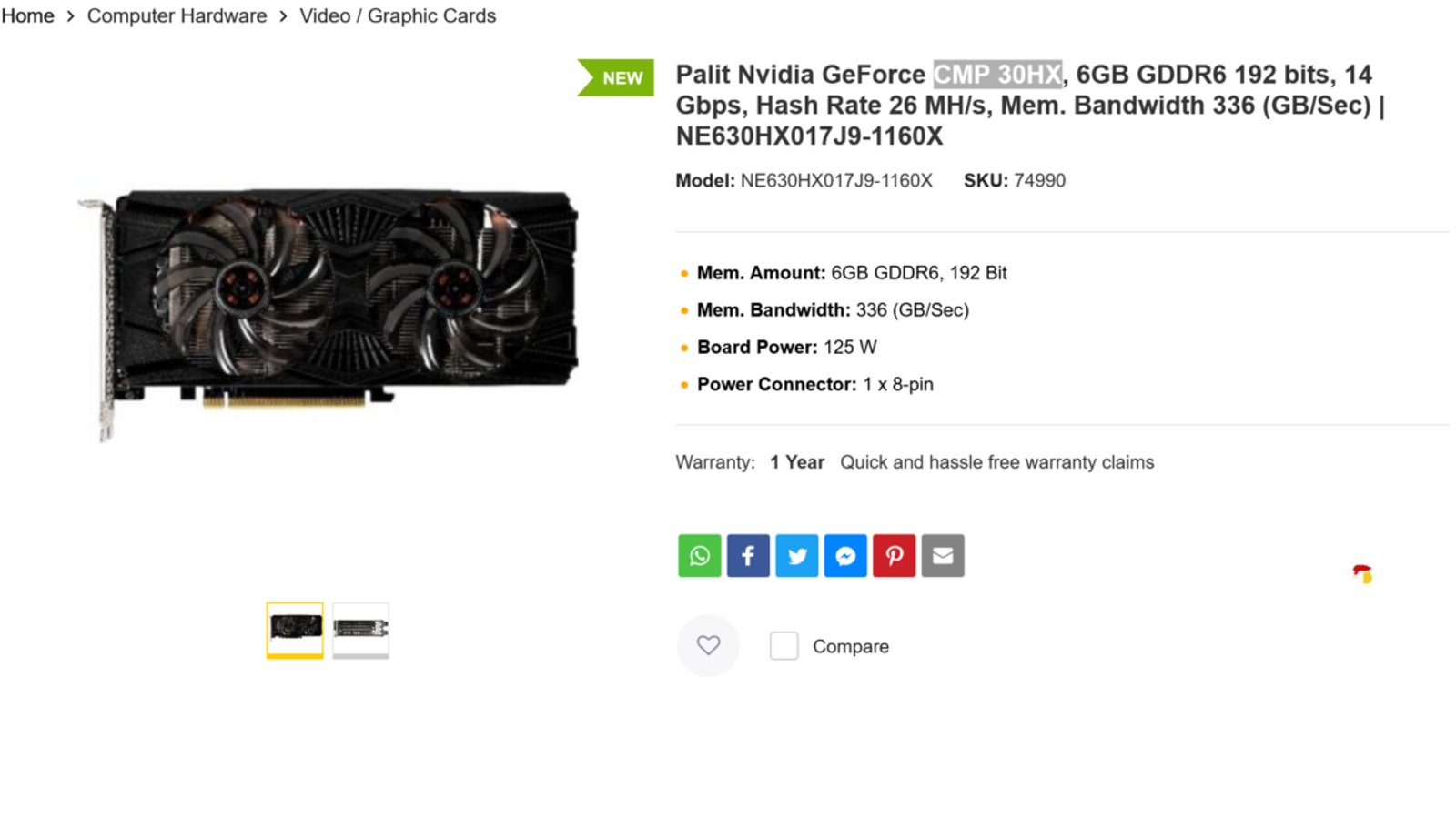 Прошло относительно немного времени с момента анонса, и 3D-карта Nvidia CMP 30HX из новой линейки моделей Cryptocurrency Mining Processor, предназначенных исключительно для майнинга, поступила в продажу. Ирония в том, что предложена она за впечатляющие 720 долларов, а это соответствует розничной цене GeForce GTX 1660 Ti/Super на текущий момент (при одинаковой производительности в майнинге), но при этом у GeForce GTX 1660 Ti/Super есть видеовыходы.