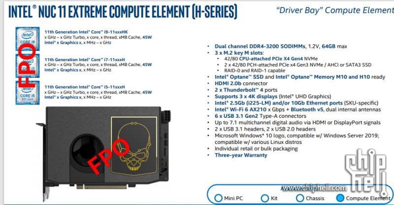 Теперь же в Сети появились данные о следующем поколении NUC 11 Extreme на основе процессоров Tiger Lake-H. Такие мини-ПК будут относиться к линейке Driver Bay и смогут предложить CPU Tiger Lake-H45 вплоть до восьмиядерных Core i9.