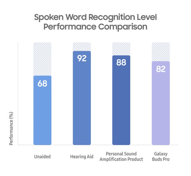 Исследования показали, что наушники Samsung улучшали восприятие людьми звуков на частотах 1000, 2000 и 6000 Гц. 57% участников тестирования, средний возраст которых составлял 63 года, сообщили, что наушники помогли им лучше общаться в тихой обстановке. К слову, это первое исследование, оценивающее эффективность полностью беспроводных наушников в сравнении с медицинскими слуховыми аппаратами.