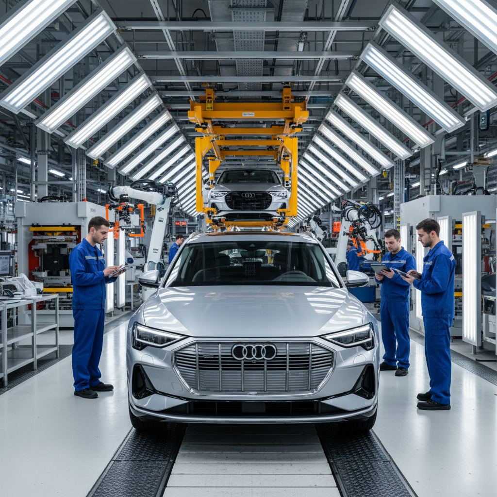 Компания опубликовала фотографии производственной линии, отметив, что выпуском Q4 e-tron заняты 1400 сотрудников сборочного конвейера.