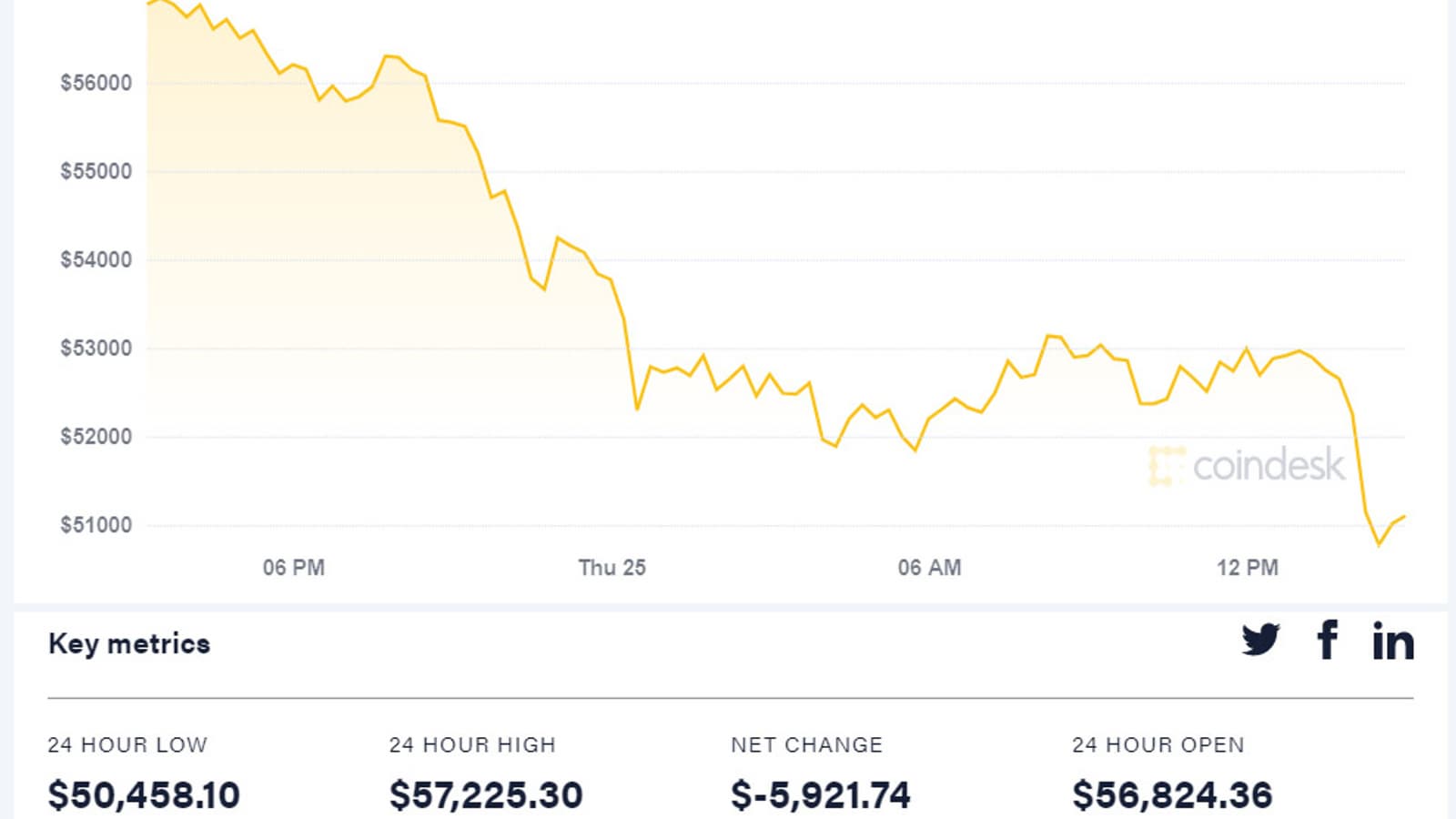 Ненадолго восстановившись примерно до 57 000 долларов за единицу, самая известная криптовалюта снова начала дешеветь. На этот раз — быстрее и сильнее, чем в понедельник. Минимальное значение, зафиксированное на протяжении последних 24 часов, примерно равно 50 458 долларам. Падение за сутки составило около 6000 долларов или более 10%. На момент написания этих строк стоимость единицы Bitcoin составляет 50 933 доллара.