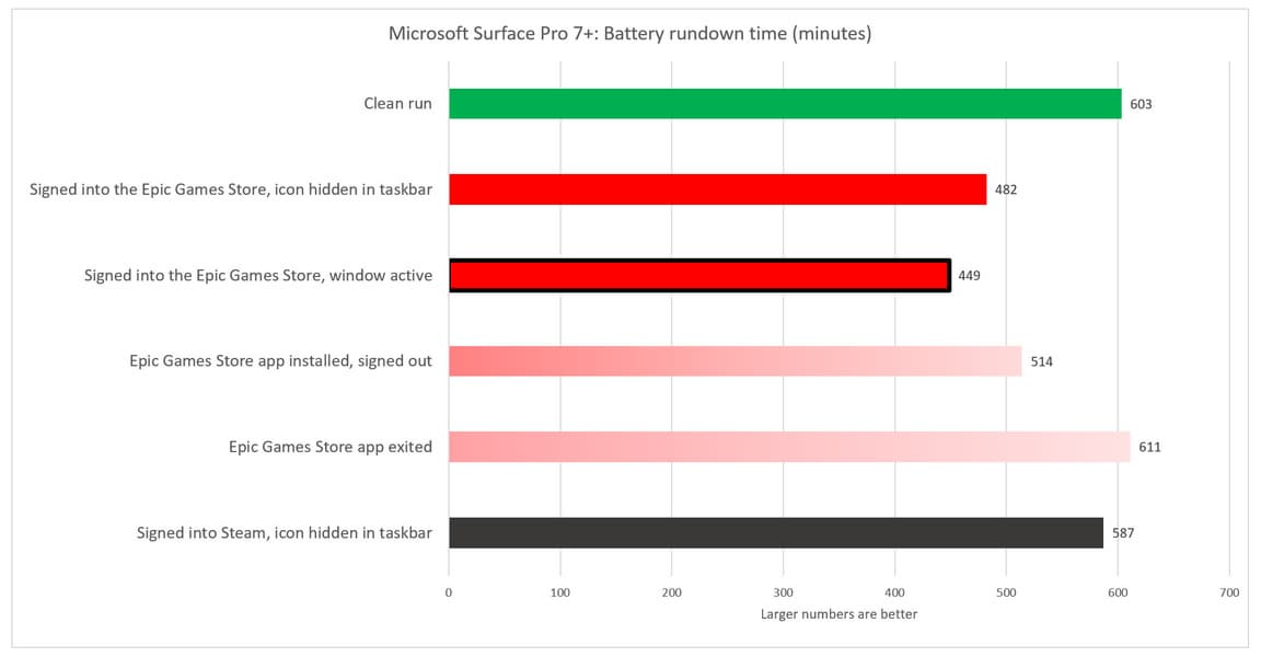 При тестировании новейшего планшета Microsoft Surface Pro 7+ у наших коллег не получилось добиться стабильных результатов в тестах автономности. Они быстро выяснили, что причина кроется как раз в лаунчере Epic Games Store, и провели дополнительные тесты, чтобы определить его влияние на работу ПК.
