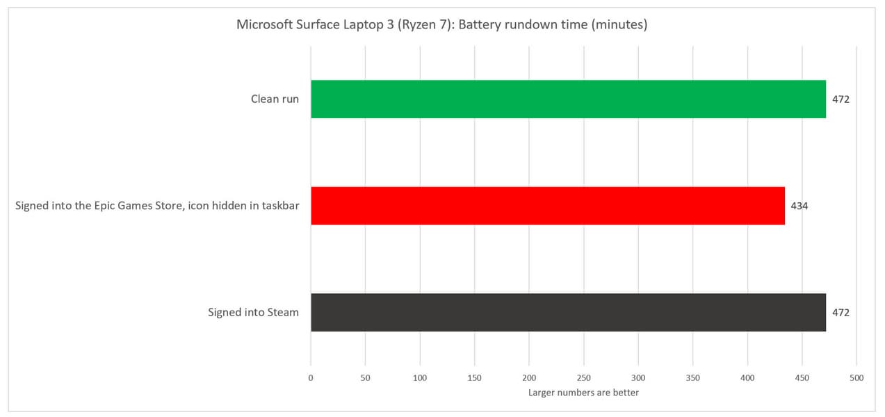 Аналогичный тест Surface Laptop 3 на процессоре Ryzen показал, что проблема там намного менее ярко выражена, хотя автономность всё-таки немного уменьшается. В итоге, если вы играете на мобильном ПК, используя программу Epic Games, лучше после игры полностью закрывать это ПО или вообще выгружать его из памяти.