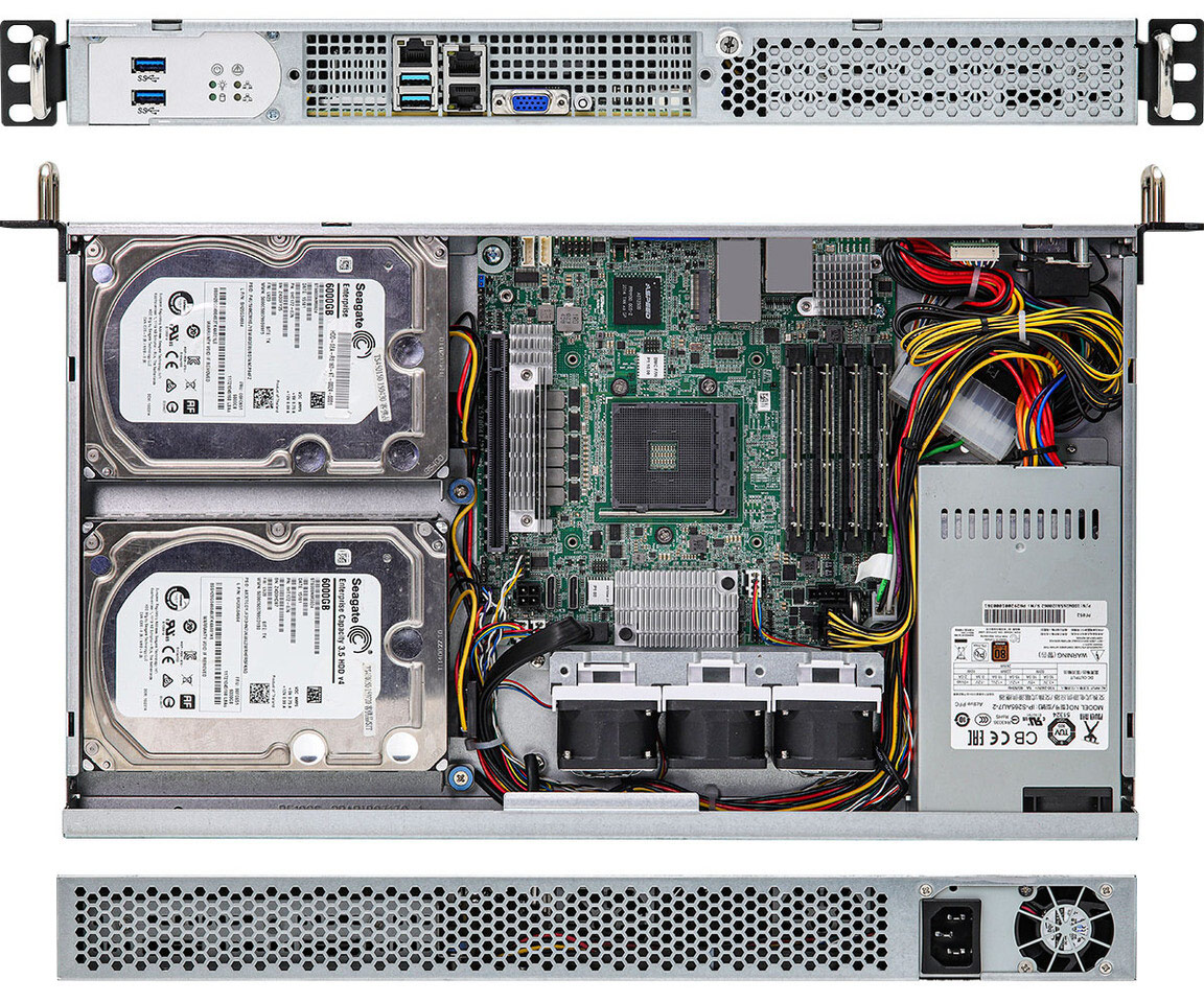 Оснащение сервера включает два порта 10 GbE на контроллере Intel X550-AT2, два порта USB 3.2 Gen1 и видеовыход D-Sub. Для удалённого управления есть порт 1 GbE на контроллере Realtek RTL8211E и контроллер ASPEED AST2500. В сервере установлен блок питания мощностью 265 Вт с сертификатом 80 Plus Bronze.