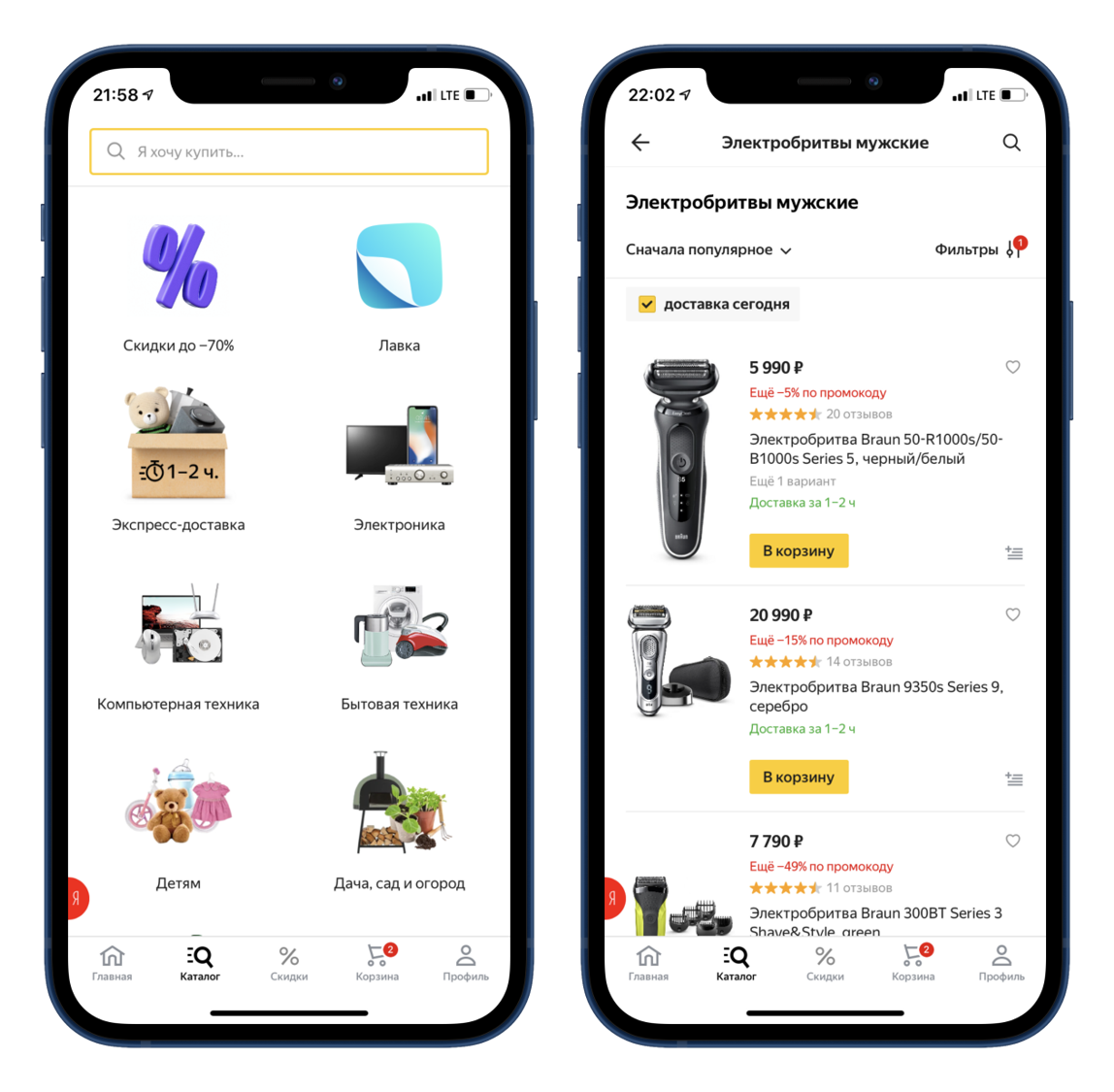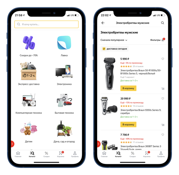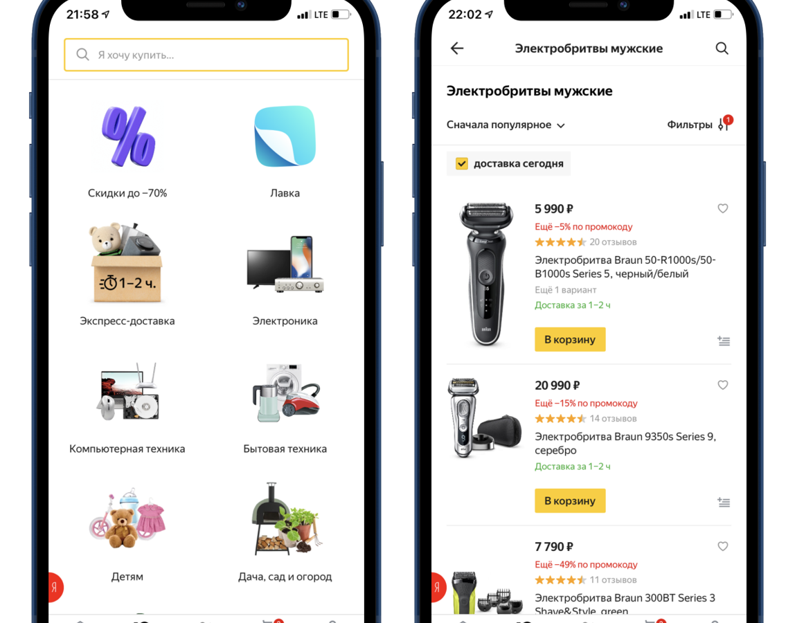 Товары, доступные для быстрой доставки, отмечены значком «Доставим за 1-2 часа». Чтобы найти их можно воспользоваться фильтром «Доставим сегодня», а также зайти в раздел каталога «Экспресс-доставка» на сайте или в мобильном приложении Яндекс.Маркета.