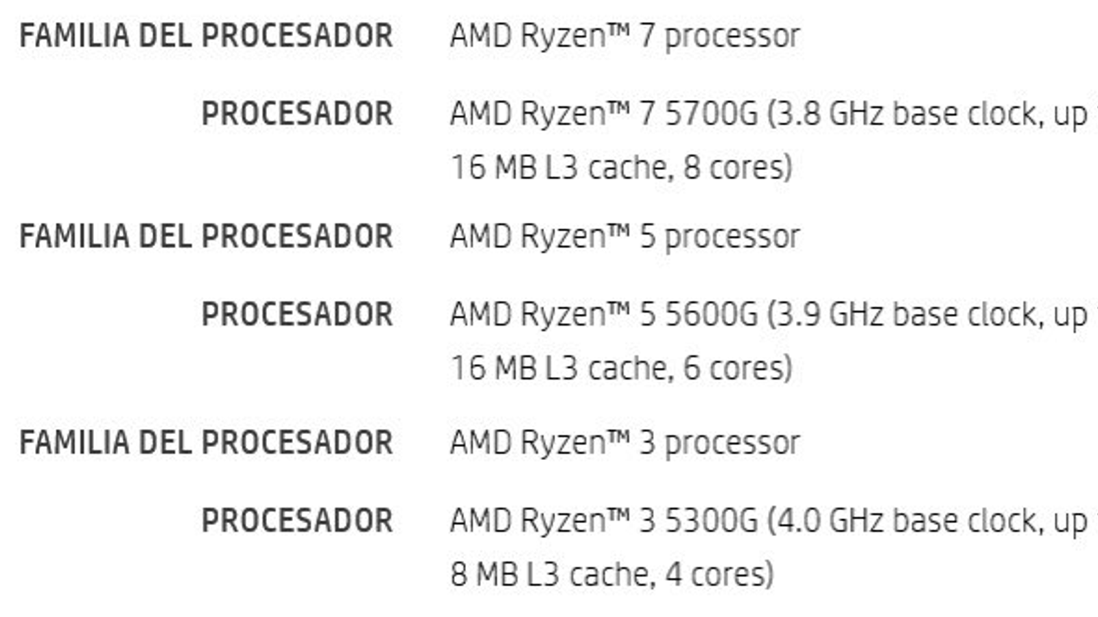 В Сети появились параметры грядущих настольных гибридных процессоров AMD Ryzen 5000G. Судя по шрифтам и характеру записи, данные эти взяты из документов HP.