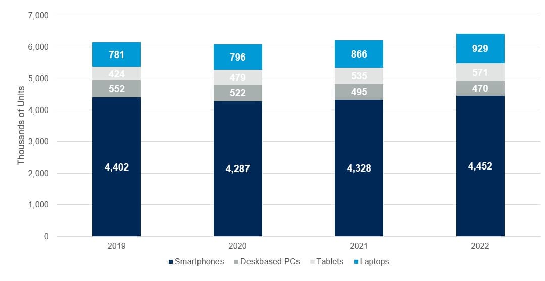 Рост продолжится и в 2022 году. Аналитики ожидают, что количество находящихся в эксплуатации устройств увеличится на 3,2% и достигнет 6,4 млрд.