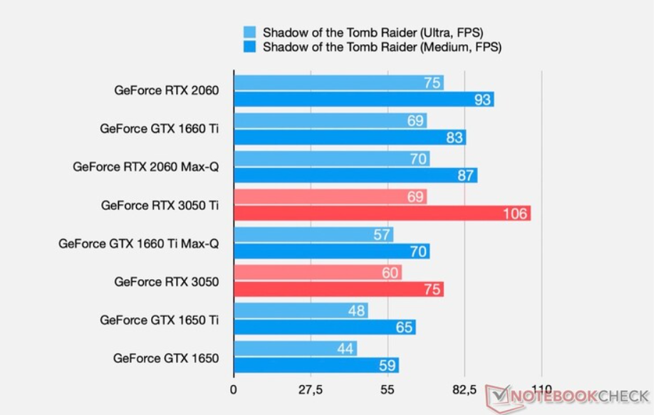Что касается производительности, как видим, младшая новинка выступает на уровне GeForce RTX 1660 Ti Max-Q и опережает GTX 1650 на 35%. В свою очередь, RTX 3050 Ti выступает уже на равных с RTX 2060 Max-Q либо GTX 1660, не особо отставая от RTX 2060. Свою условную предшественницу она опережает на 40%.