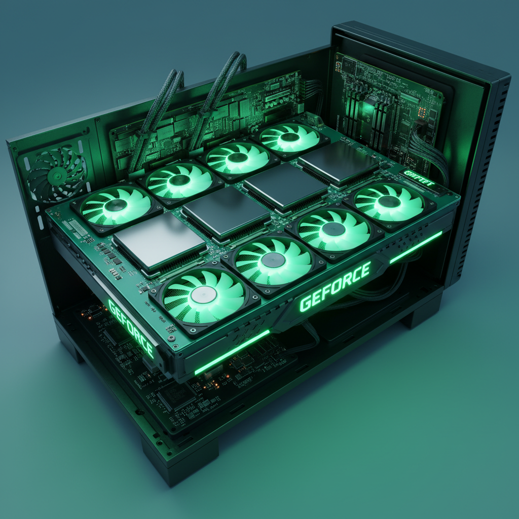 Видеокарта, по словам владельца, располагает 18 000 ядрами CUDA в четырёх чипах, 48 ГБ памяти GDDR7 и требует 1 кВт мощности. Так как это очень много для обычных разъёмов, которые мы привыкли видеть на видеокартах, у новинки просто имеется два стандартных разъёма под кабель питания.