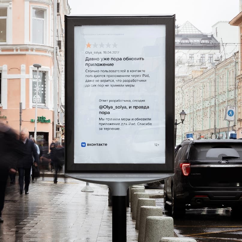Столь эпохальное событие команда соцсети поддержала размещением наружной рекламы в пяти городах: Санкт-Петербурге, Москве, Казани, Екатеринбурге и Нижнем Новгороде. На макетах изображены реальные отзывы пользователей и ответы на них.