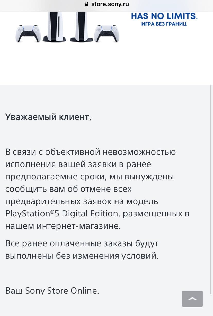 Например, в Twitter появились жалобы на отменённые неоплаченные заранее предзаказы более дешёвой версии приставки — Digital Edition. В качестве доказательства прилагаются скриншоты с оповещением от Sony Store, где сообщается об «объективной невозможности исполнения заявки».