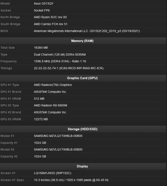 Что касается самого ноутбука, то другая его особенность — мощный процессор Ryzen 9 5900HX. Также в наличии 16 ГБ оперативной памяти, два SSD объёмом по 1 ТБ и экран разрешением Full HD с кадровой частотой 60 Гц. Надо отметить, что высокопроизводительные GPU и CPU «упакованы» в небольшой корпус ноутбука с экраном диагональю 15,6 дюйма. Так что в данном случае TDP Radeon RX 6800M составляет, скорее всего, те самые 100 Вт, а не 145 Вт.