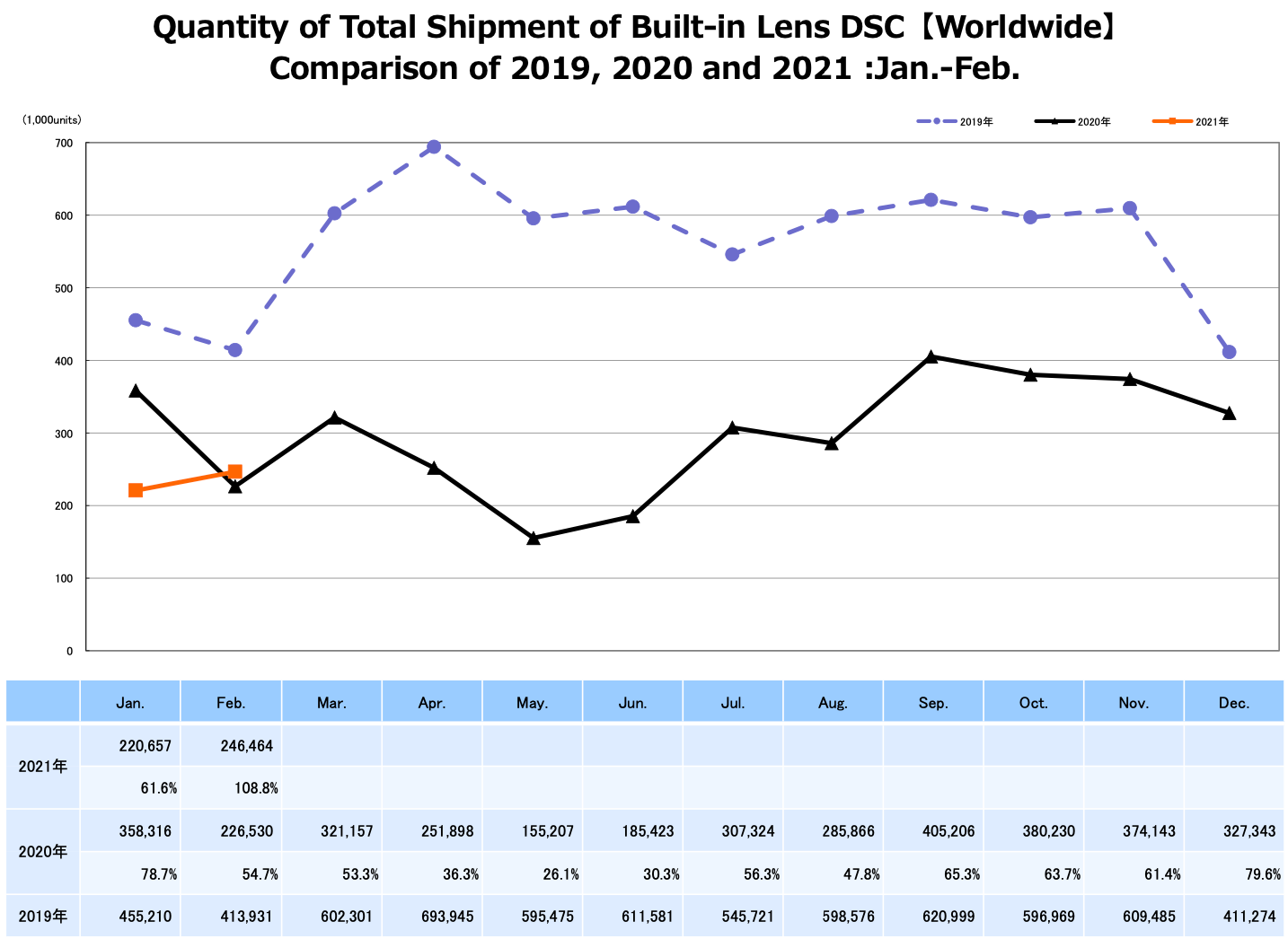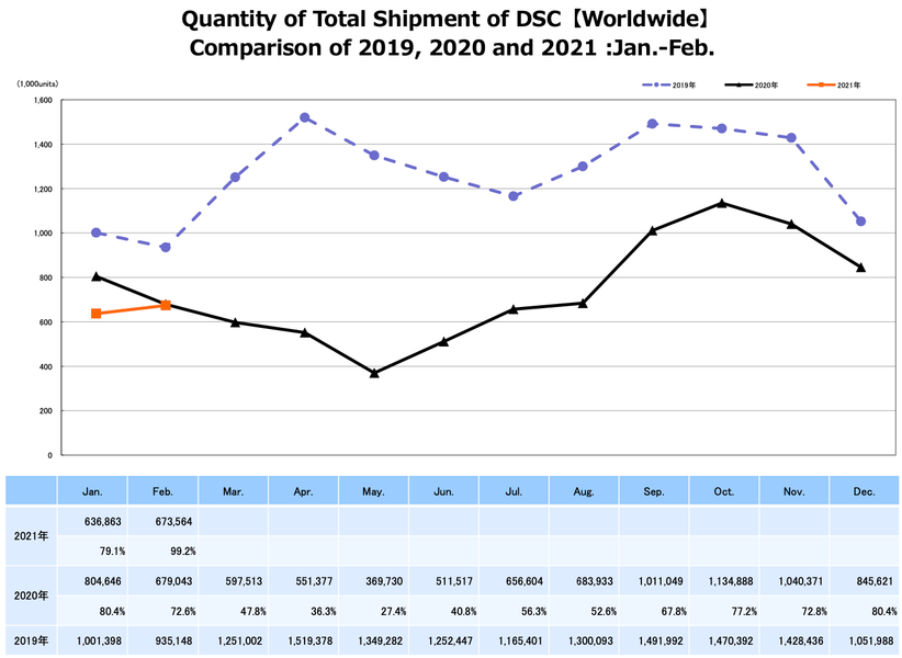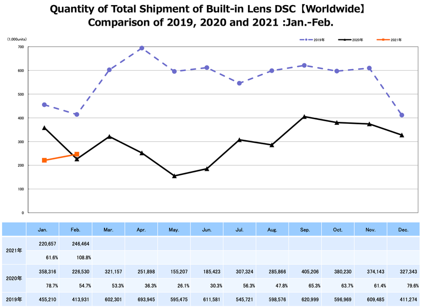 Камер с несменными объективами было отгружено 246 464 штуки. Это на 11,7% больше, чем в предыдущем месяце, и на 8,8% больше, чем за год до этого. В денежном выражении продажи камер этой категории по сравнению с январём текущего года уменьшились на 1,2%, а по сравнению с февралём прошлого года — на 18,5%.