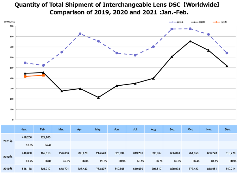 Камер со сменными объективами за февраль было отгружено 427 100 штук. Это на 2,6% больше, чем в январе, но на 5,6% меньше, чем год назад. Интересно, что в денежном выражении продажи выросли на 10,0% и 29,7% соответственно.