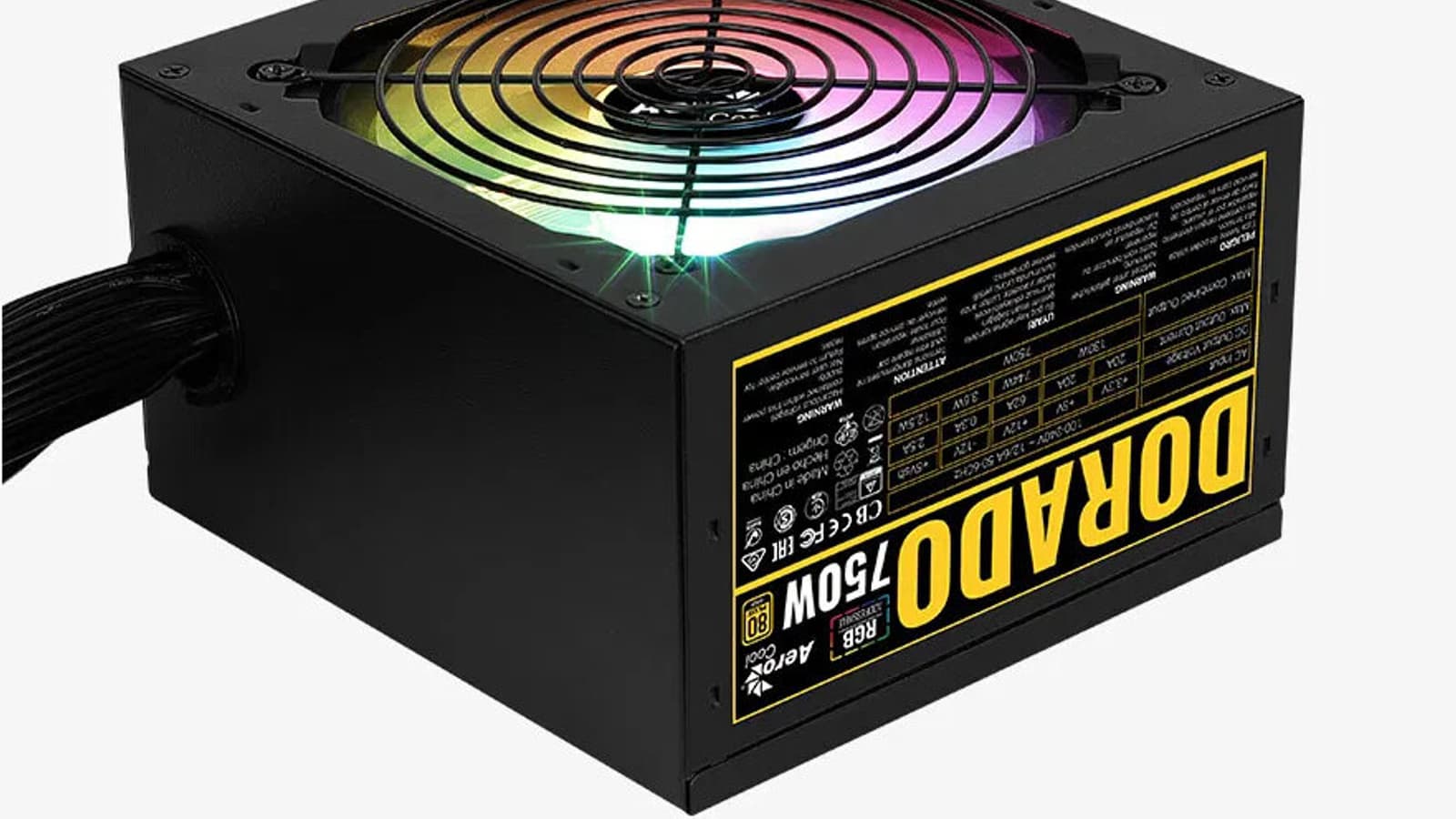 Серия AeroCool Dorado включает блоки питания мощностью 550 Вт, 650 Вт и 750 Вт. Каждая модель имеет два 8-контактных (4 + 4) разъёма EPS. Модель мощностью 750 Вт оснащена тремя 8-контактными (6 + 2) разъёмами PCIe, тогда как у моделей мощностью 650 и 550 Вт таких разъёмов два. Все кабели — плоские.