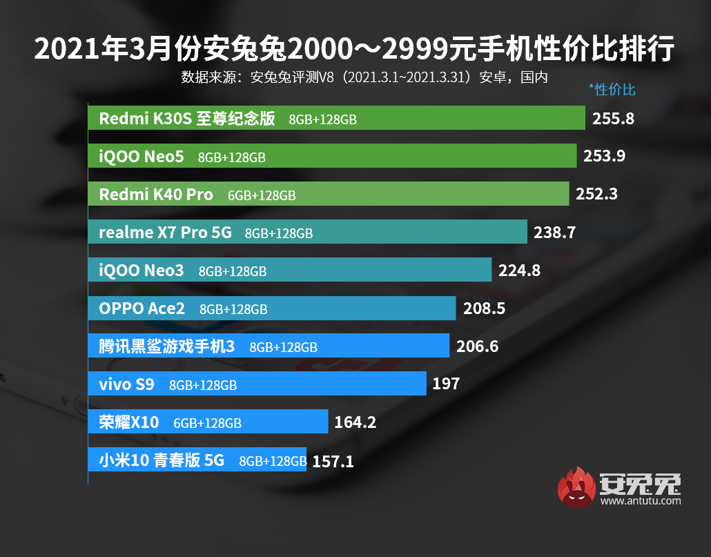 Рейтинги постепенно захватывают смартфоны Xiaomi и экосистемных брендов — им принадлежат первые места в четырёх ценовых категориях из пяти. В самой бюджетной категории, до 1999 юаней (305 долларов), первое место занял Redmi K40 в версии 6/128 ГБ, на втором месте находится Motorola Edge S, а на третьем — Realme Q2 5G.