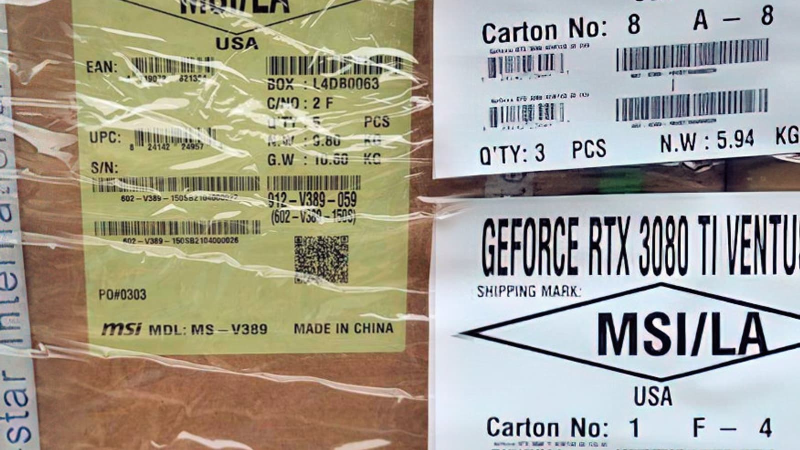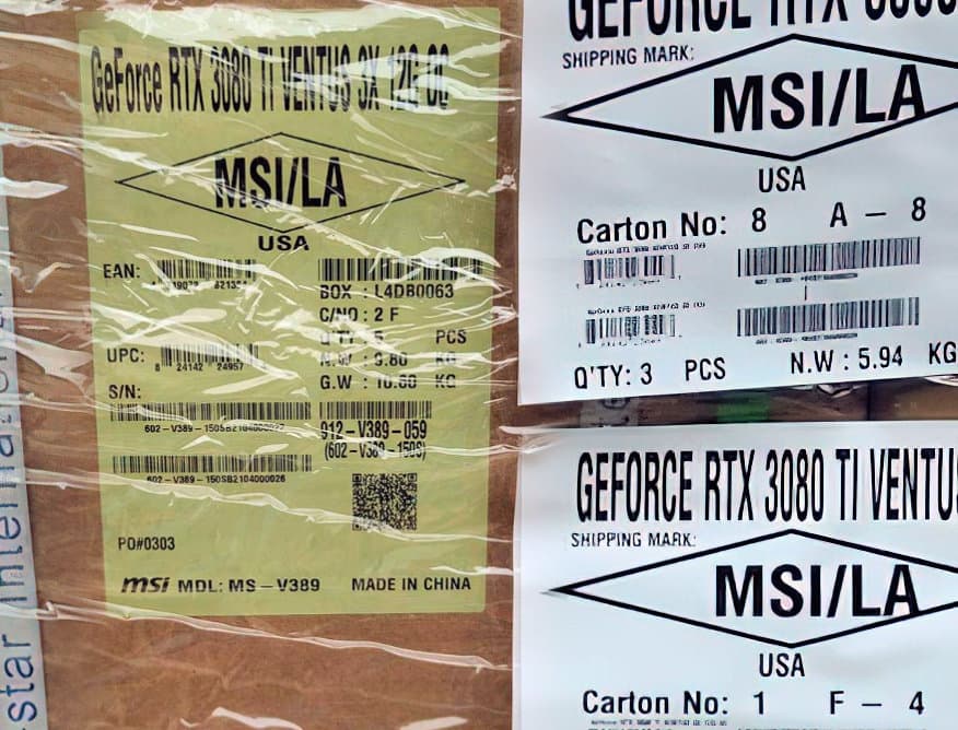 Как минимум партия таких карт MSI сейчас направляется в Лос-Анджелес. Вместе с ней едут RTX 3080, RTX 3090, Radeon RX 580 и даже GeForce GT 710.