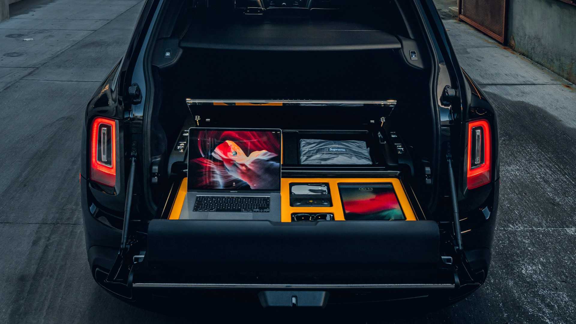 Ящик является съёмным, клиент может заказать несколько подобных модулей с разной начинкой для разных сценариев. В зависимости от потребностей заднюю часть автомобиля можно превратить в мини-бар со стаканами, кухонными приборами и разделочной доской, полевой офис с ноутбуком, планшетом и прочей электроникой, а также добавить добавить парочку складных стульев и коктейльный столик.