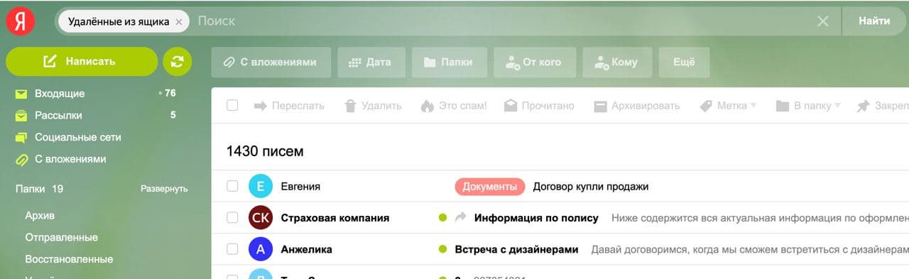 При активации в настройках автоматического копирования сервис будет создавать копии всех удалённых писем, которые будут храниться в специальном хранилище полгода. Найти случайно удалённое письмо даже спустя несколько месяцев можно, нажав кнопку «Посмотреть удалённые письма».