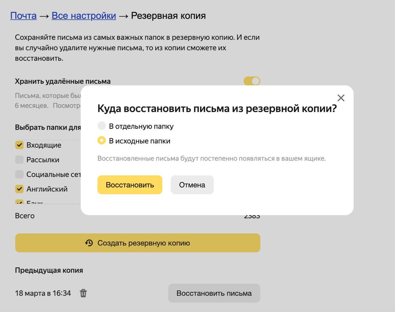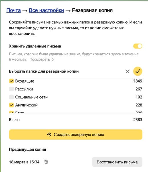 Сервис позволяет также сделать копию нужных папок или всего ящика. Она сохранит такую же структуру, что и оригинал на момент копирования. Чтобы запустить копирование, нужно выбрать нужные папки и нажать «Создать резервную копию». А когда понадобится копия, можно получить её с помощью кнопки «Восстановить письма». Для дополнительной защиты, прежде чем создать или восстановить копию, понадобится ввести пароль от почты или код из SMS.