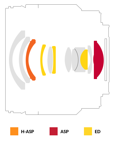 - оптическая схема — 12 элементов в 10 группах, включая элемент H-ASP, элемент ASP и 3 элемента ED;