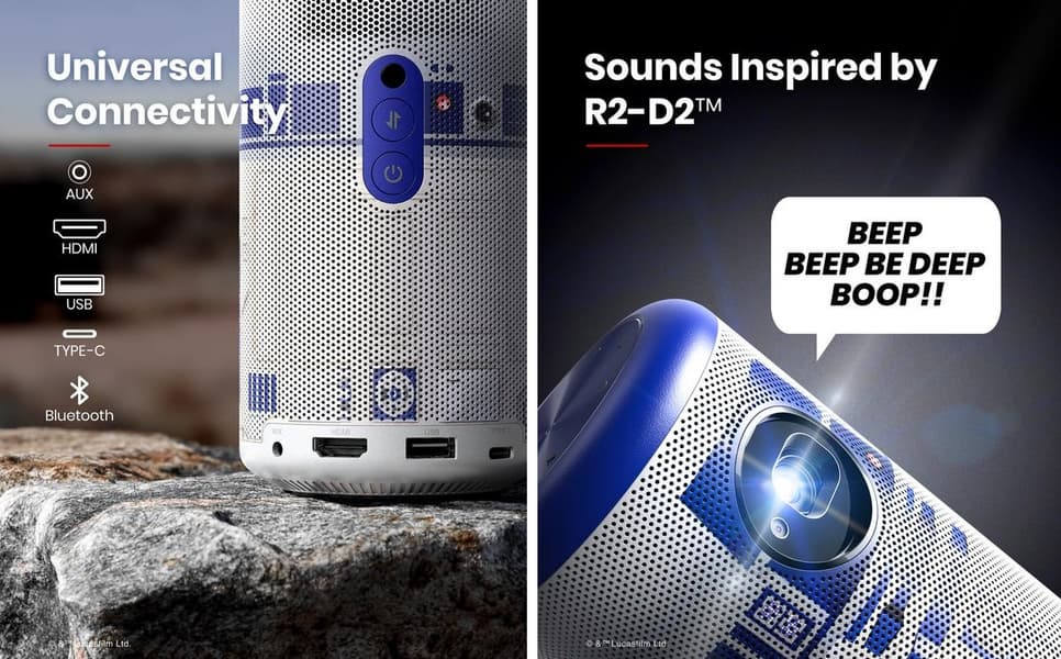 Anker Nebula Capsule II Star Wars R2-D2 Limited Edition окрашен в те же цвета, что и популярный робот R2-D2 из вселенной «Звёздных войн». Производитель говорит, что дизайн вдохновлён культовой сценой из «Звездных войн: Новая надежда», в которой принцесса Лея отправляет голографическое сообщение Оби-Вану Кеноби при помощи дроида.