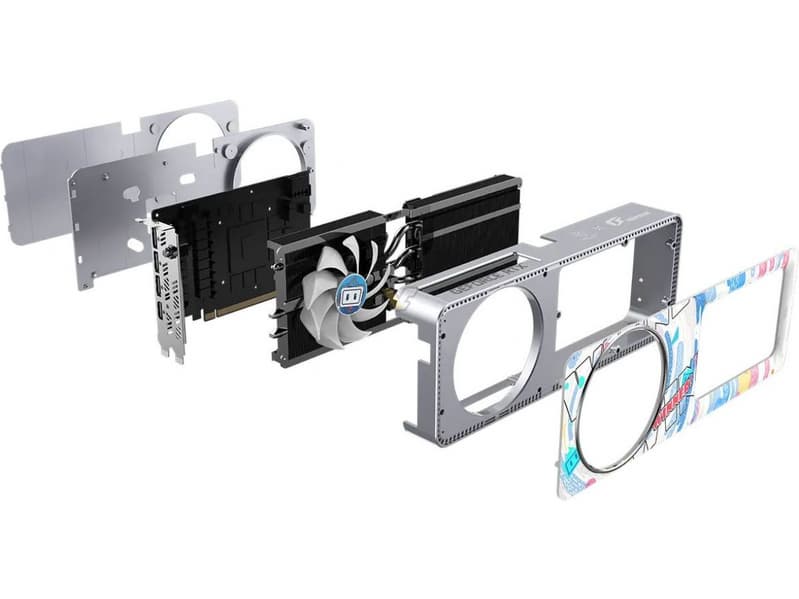 Особенностью карты является система охлаждения с двумя вентиляторами, вынесенными на разные стороны. На иллюстрациях видно, что она существенно длиннее печатной платы. Длина карты равна 288 мм, высота — 118 мм. На сдвоенной монтажной планке установлены три разъёма DP 1.4 и один — HDMI 2.1.