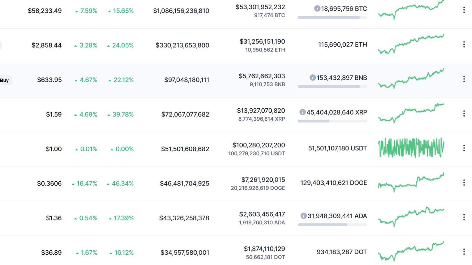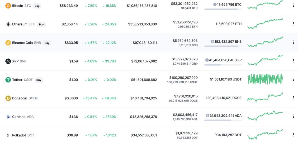 Но куда быстрее растет Ethereum – почти на четверть за неделю! Итого за один ETH дают сейчас 2850 долларов. Рубеж в 3000 долларов уже очень близко. Остальные криптовалюты из Топ-10 тоже окрашены в зеленый цвет. Так, например, любимая Илоном Маском Dogecoin прибавила за неделю 46%!