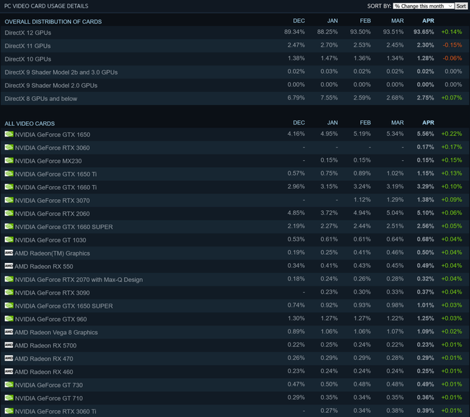 Сервис Steam опубликовал апрельскую статистику использования аппаратных компонентов. Трудные времена на рынке видеокарт привели к тому, что первое место по приросту занимает старенькая GeForce GTX 1650, но при этом на второе место уже пробилась GeForce RTX 3060, которую сейчас продают за 1000 долларов вместо официальных 330 долларов. Но куда интереснее модель, расположившаяся на третьем месте. Это… GeForce MX230 – один из самых бюджетных dGPU Nvidia для ноутбуков.