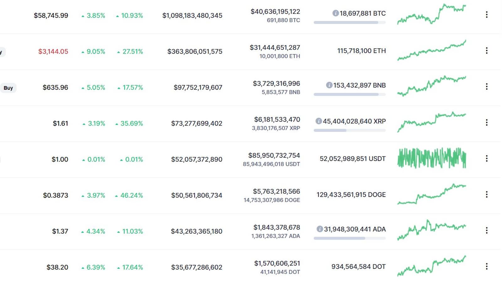 Остальные криптовалюты тоже растут, пускай и не так сильно, как Ethereum. Например, Bitcoin за сутки прибавил около 3,5%, сейчас за 1 BTC дают около 58 800 долларов. Binance Coin прибавила за сутки около 5% и достигла отметки в 635 долларов. Bitcoin Cash тоже прибавил около 5% за сутки и перешел порог стоимости 1000 долларов. Растет и любимая Илоном Маском Dogecoin.