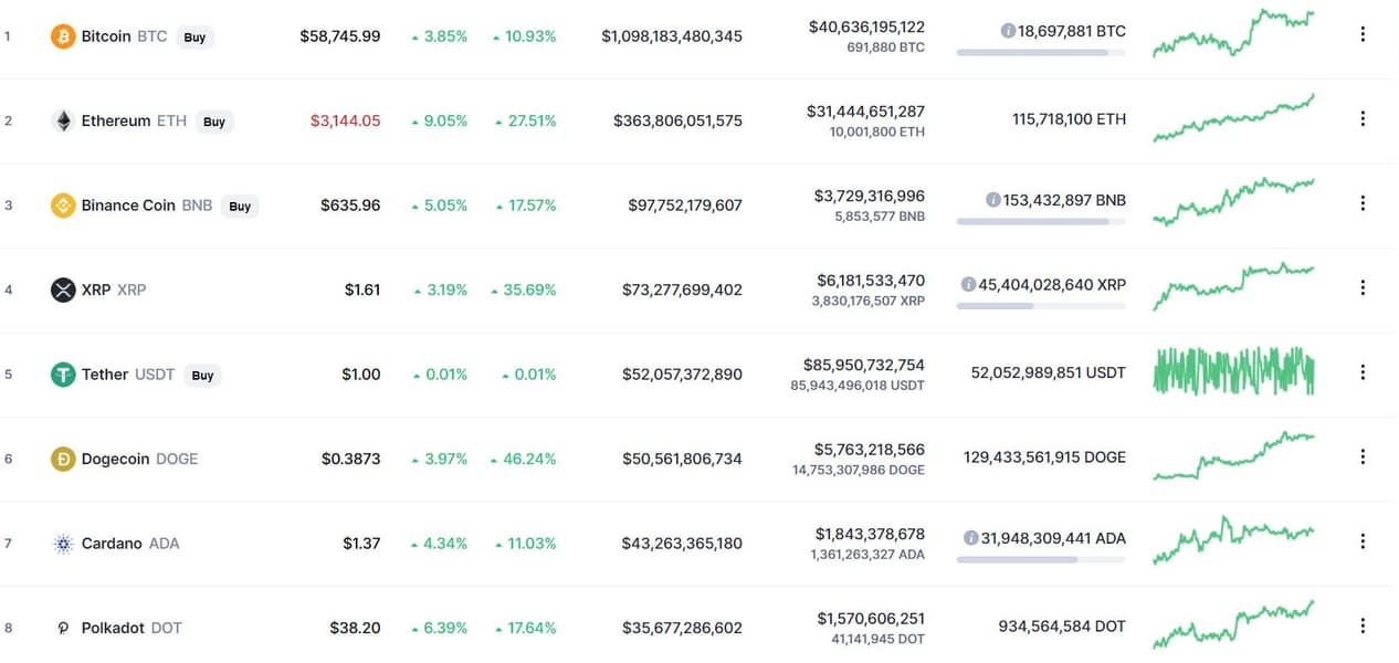 Остальные криптовалюты тоже растут, пускай и не так сильно, как Ethereum. Например, Bitcoin за сутки прибавил около 3,5%, сейчас за 1 BTC дают около 58 800 долларов. Binance Coin прибавила за сутки около 5% и достигла отметки в 635 долларов. Bitcoin Cash тоже прибавил около 5% за сутки и перешел порог стоимости 1000 долларов. Растет и любимая Илоном Маском Dogecoin.