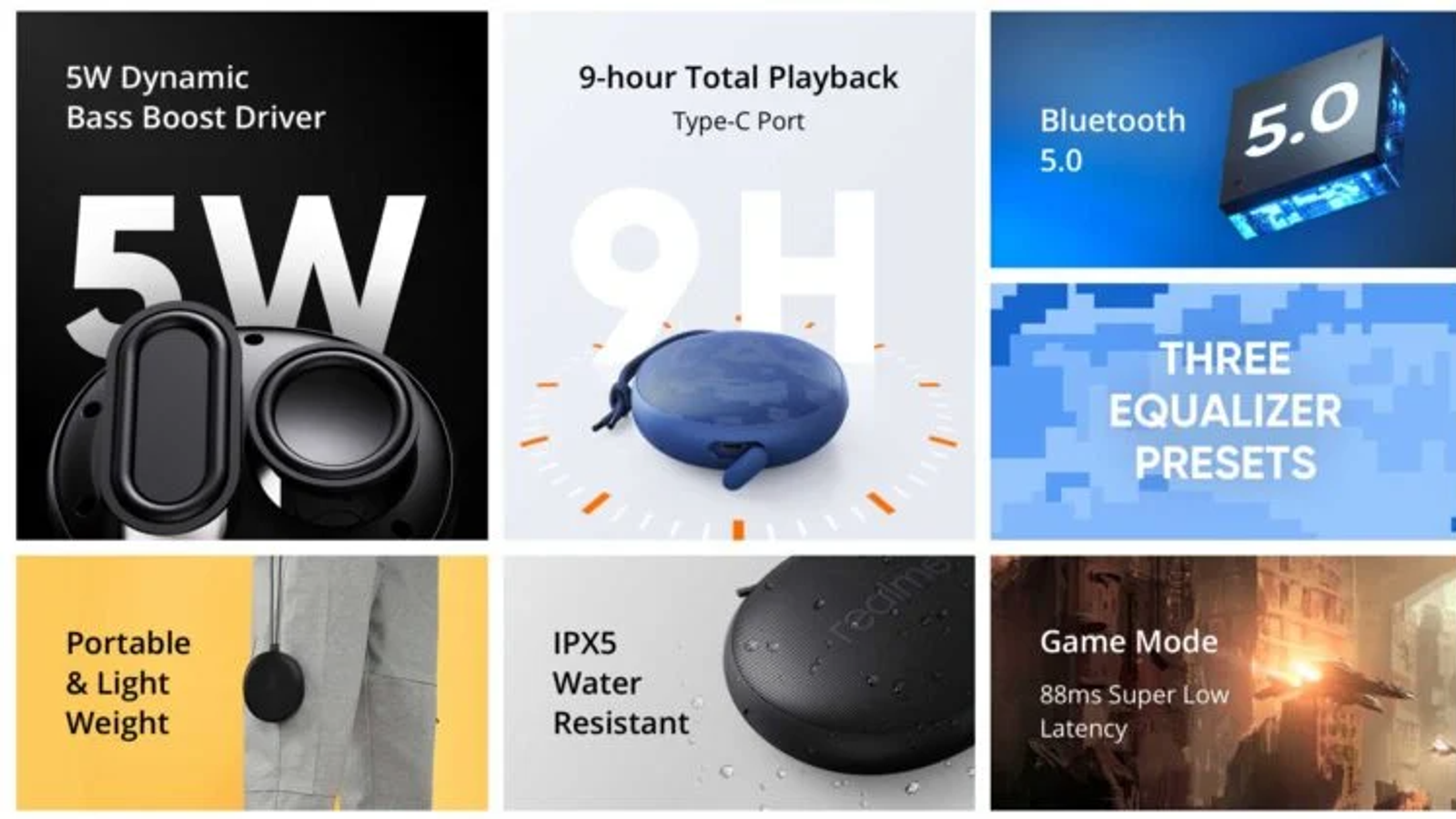Bluetooth-динамик Realme Cobble соответствует степени защиты IPX5, что означает, что он выдерживает брызги воды. Однако необходим убедиться, что крышка, закрывающая порт USB-C, находится на своём месте. Динамик имеет динамический драйвер мощностью 5 Вт в сочетании с пассивным излучателем низких частот для получения более чистого и мощного звука.