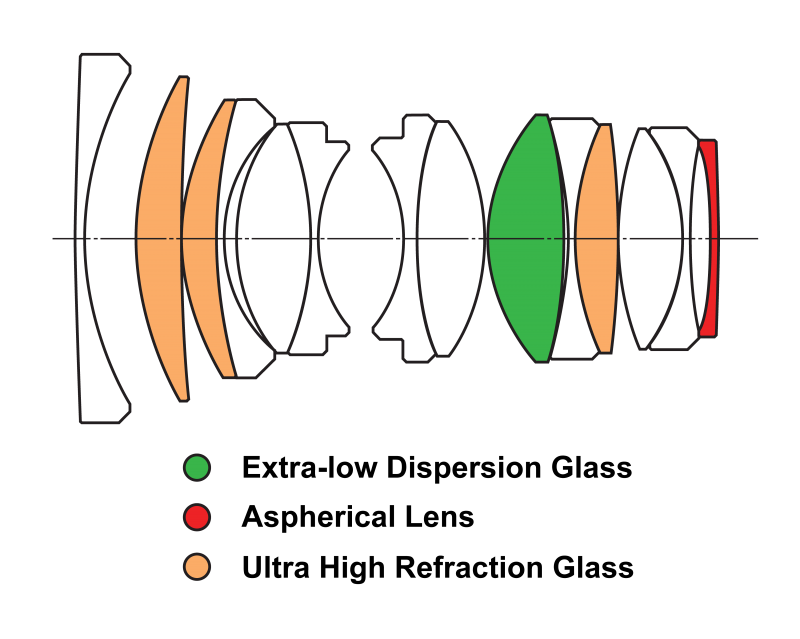 - оптическая схема — 14 элементов в 9 группах, включая один элемент со сверхнизкой дисперсией, один асферический элемент и три элемента со сверхвысоким коэффициентом преломления;