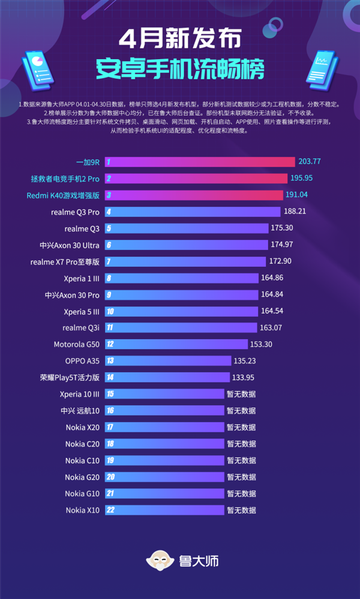 Первое место занял 120-герцевый смартфон OnePlus 9R, который оснащён однокристальной системой Snapdragon 870, который превзошёл все флагманские модели на базе мобильной платформы Snapdragon 888. Его результат превысил 203 балла. С выходом OnePlus 9 производитель перешел в Китае на оболочку ColorOS, которая заменила Hydrogen OS.