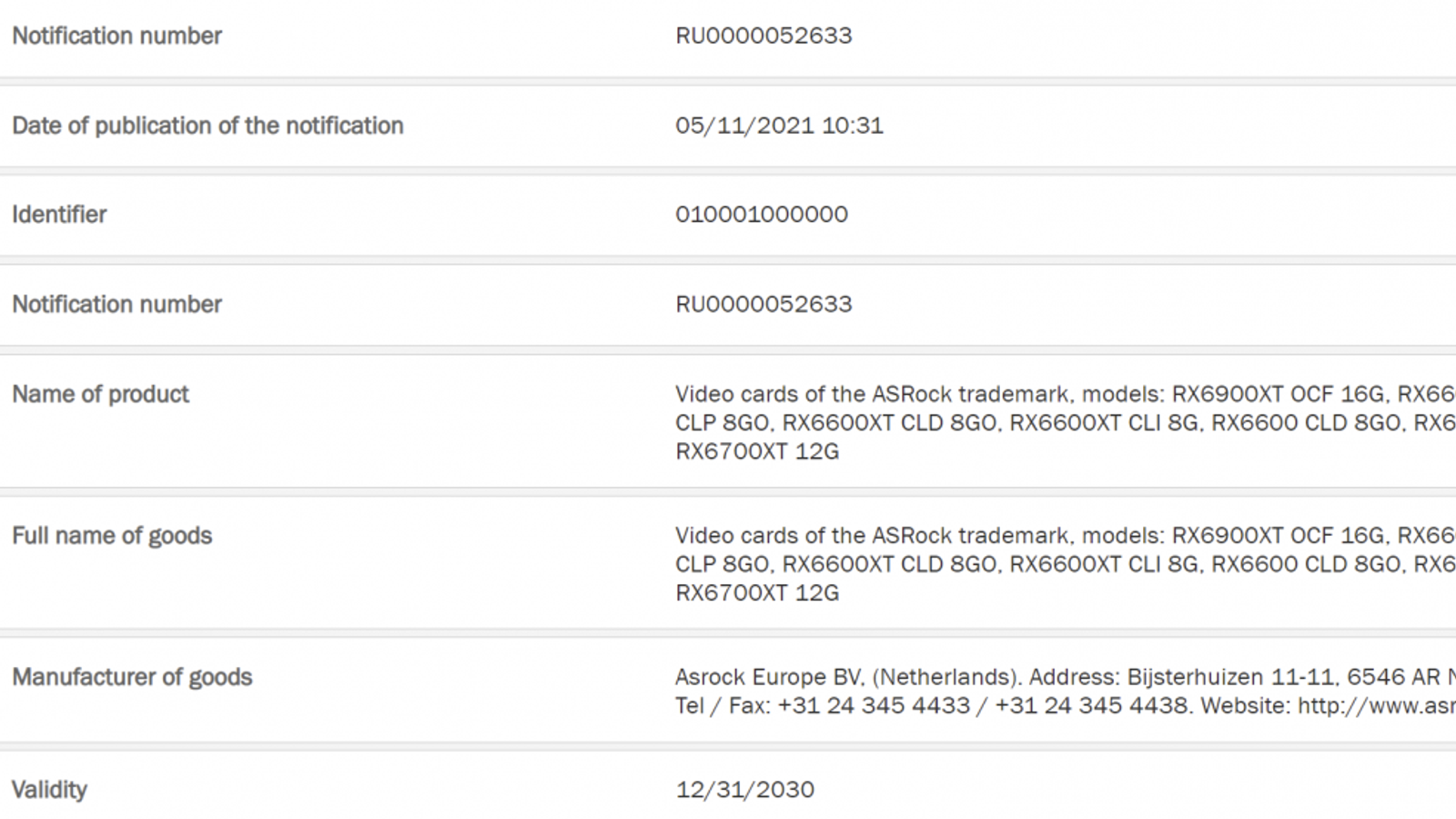 Источник обнаружил на сайте ЕЭК (Евразийской экономической комиссии) новую заявку от европейского представительства ASRock. В ней упоминаются видеокарты Radeon RX 6600 и RX 6600 X. Интересно, что объём памяти GDDR6 указан равным 8 ГБ. По мнению источника, это может быть подтверждением того, что у карт серии RX 6600 будет 128-битная шина памяти.