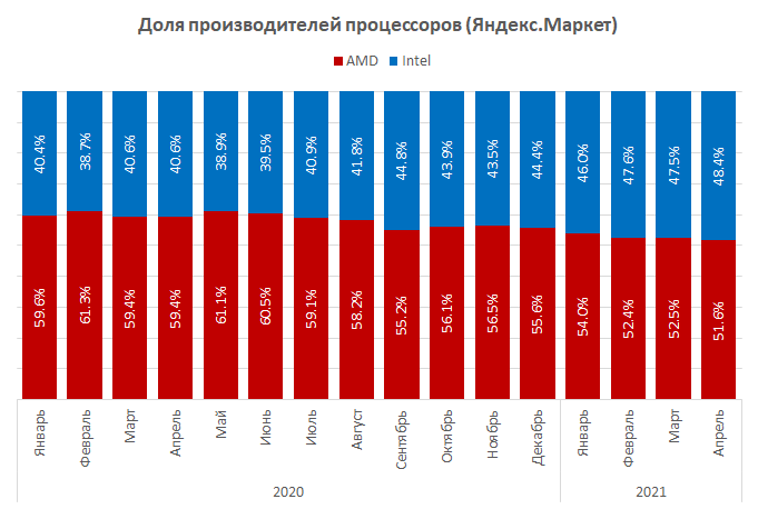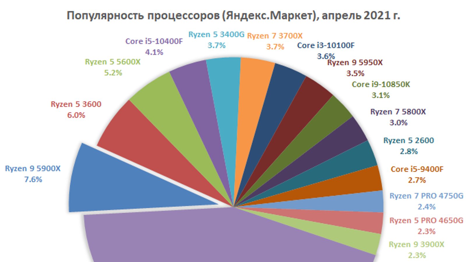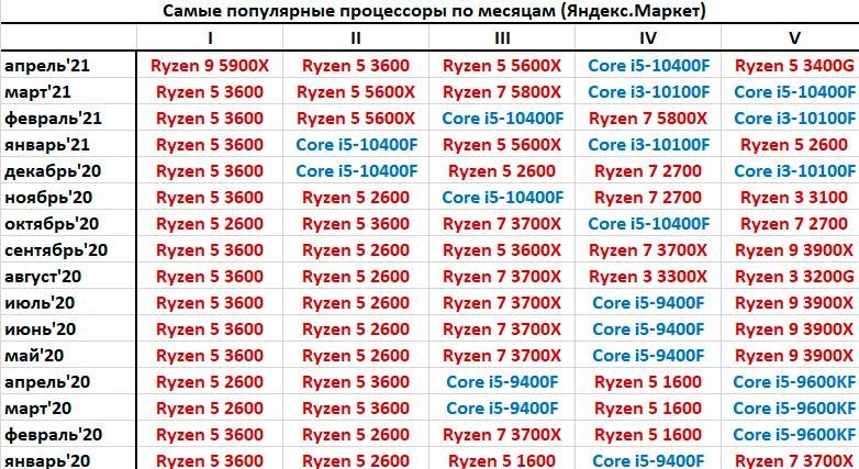 Сервис Яндекс.Маркет опубликовал статистику продаж процессоров за апрель, и на этот раз в чарте одно очень важное изменение: его больше не возглавляет шестиядерный CPU AMD! Практически полтора года лидером на нашем рынке был бюджетный шестиядерный Ryzen 5 3600, но в апреле всё изменилось: теперь лидер — куда более мощный 12-ядерный Ryzen 9 5900X. Судя по всему, AMD наконец-то сделала то, что обещала: нарастила поставки Ryzen 5000, поэтому в апреле партнёры компании смогли удовлетворить спрос пользователей и на эту, и на другие топовые модели серии.